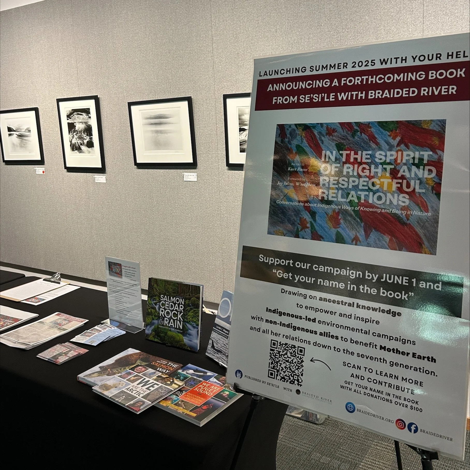 Last week, we attended a reception following a Se’Si’Le multi-day retreat on Indigenous leaders and Human Rights scholars discussing just transitions for Indigenous sovereignty and restoring biodiversity. Tribal communities, including the Udege, Itelman, Lummi, Yakama, and Tsleil-Wauth First Nation shared culture, music, and ceremony at this inspiring and informative event. Braided River was honored to showcase our forthcoming book, In the Spirit of Right and Respectful Relations, in partnership with Se’Si’Le.